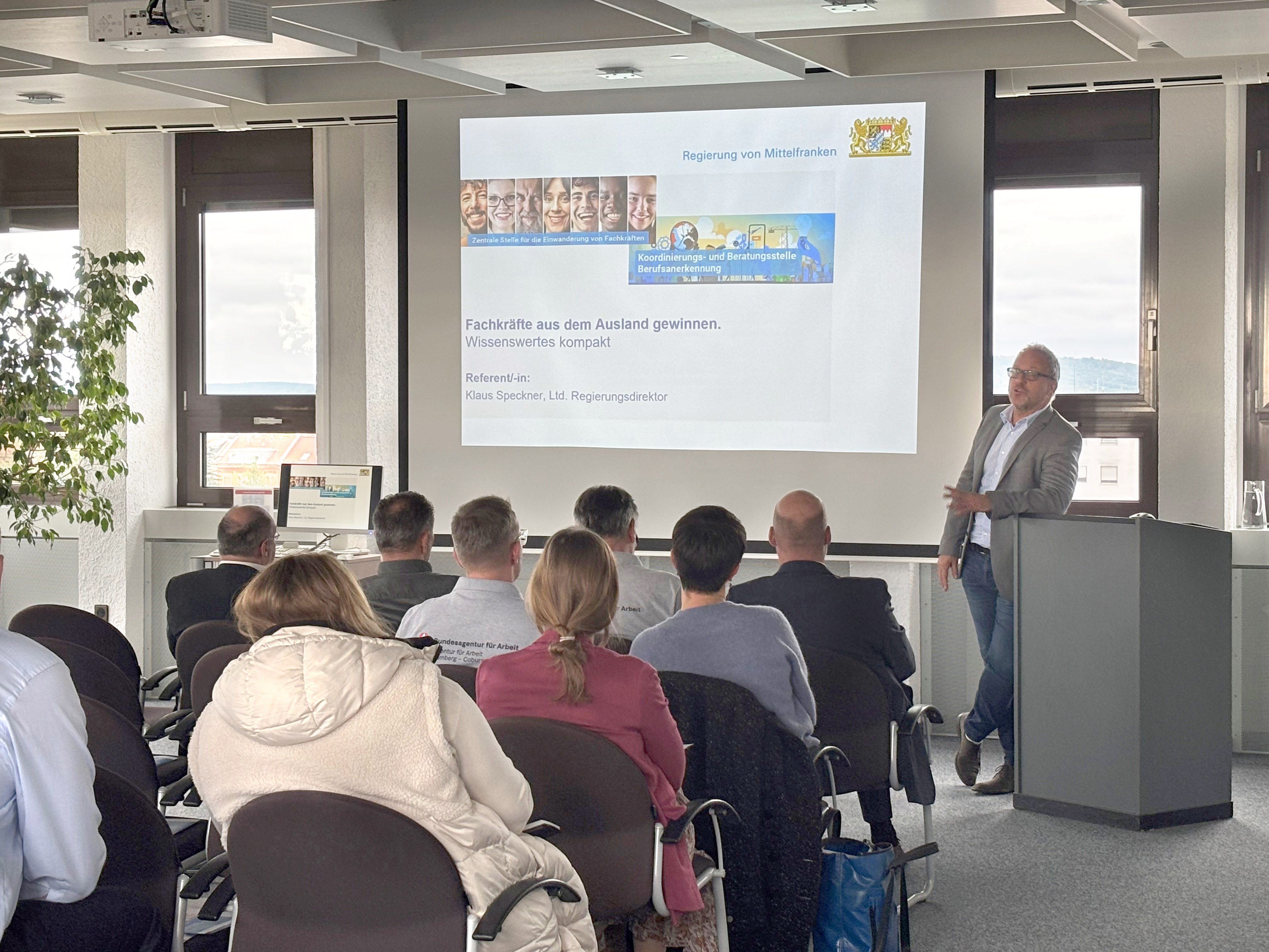 Die Veranstaltung wurde durch einen Vortrag der Agentur für Arbeit Bamberg abgerundet. Wilhelm Schmitt stellt das umfangreiche Dienstleistungsangebot zur Gewinnung von Fachkräften aus dem Ausland vor. Den Abschluss der Veranstaltung bildete ein Get-together, bei dem die Teilnehmenden die Gelegenheit hatten, sich mit den Referentinnen und Referenten auszutauschen und individuelle Anliegen zu besprechen.