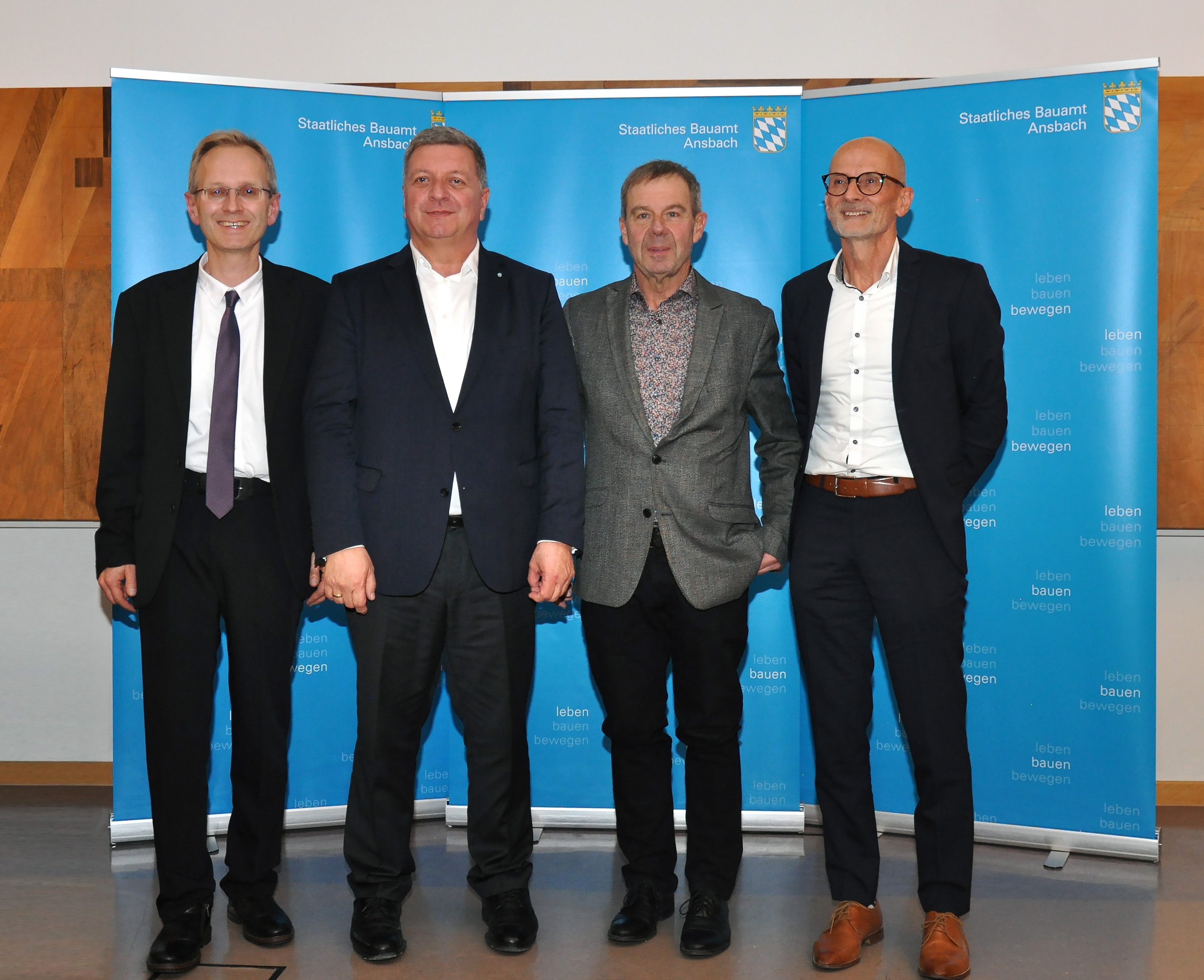 Der Bayerische Staatsminister für Wohnen, Bau und Verkehr Christian Bernreiter verabschiedete heute gemeinsam mit Regierungsvizepräsidentin Birgit Riesner den langjährigen Leiter des Staatlichen Bauamtes Ansbach und Bereichsleiter Straßenbau des Staatlichen Bauamtes, Heinrich Schmidt, in den Ruhestand. Gleichzeitig wurden der Bereichsleiter Hochbau Hubert Wagner als neuer Behördenleiter und Martin Assum als neuer Bereichsleiter Straßenbau offiziell neu in ihre Ämter eingeführt.